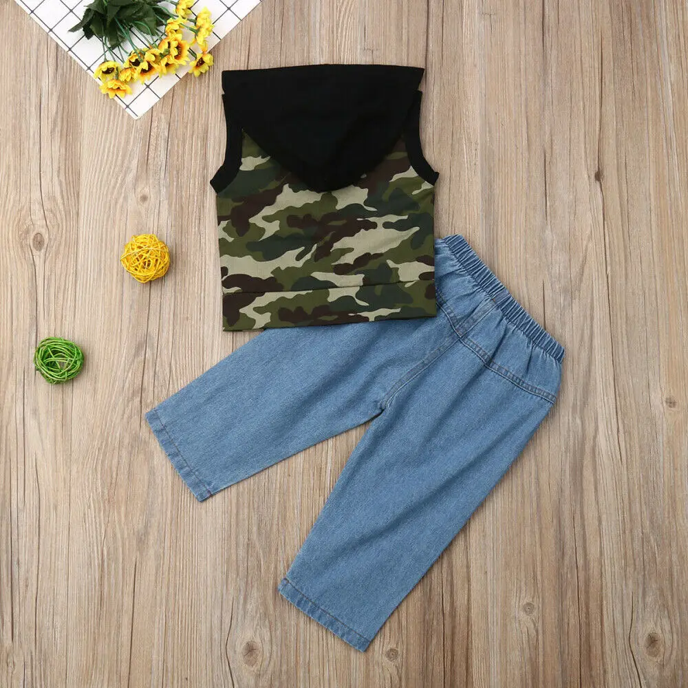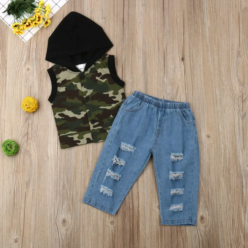 Limited Offer for 0-5T Toddler Kid Baby Boy Sleeveless Camouflage Hooded Top Vest Ripped Hole Jeans Long Pants Summer