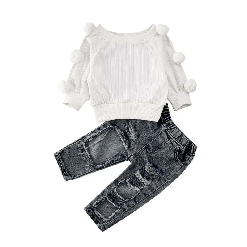 Best Price of 1-5Y Toddler Baby Girl Knitted Sweater Solid White Long Sleeve Tee Tops Ripped Hole Jeans Pockets L