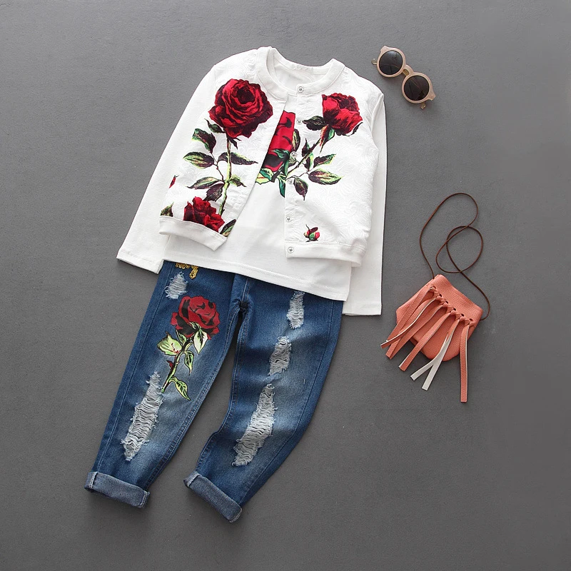 Cheap Offer of 3PCS/3-10Years/Spring Autumn Baby Girls Boutique Clothing Set Flower White Kids Jacket+T-shirt+Jean